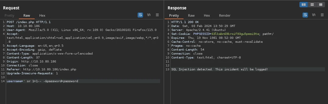 Trying a simple SQL injection on the login page, we get the message: SQL Injection detected. This incident will be logged!.