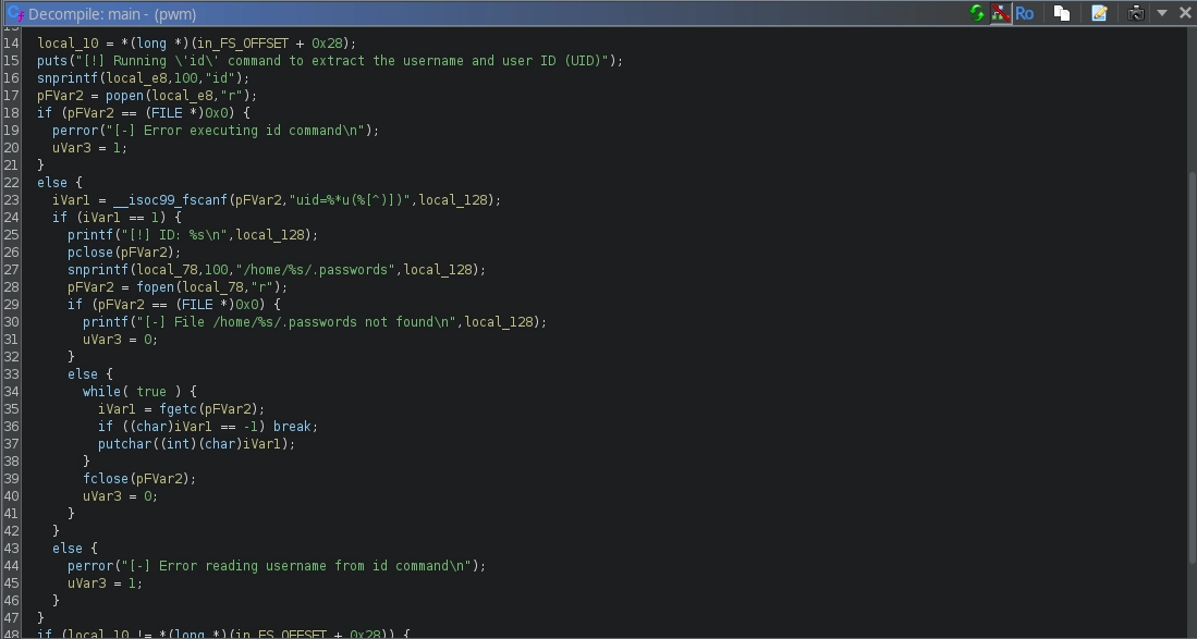 /home/<username>/.passwords, and tries to open it as a file. If it fails, it prints an error message and exits. If it successfully opens the file, it prints the contents of the file character by character.