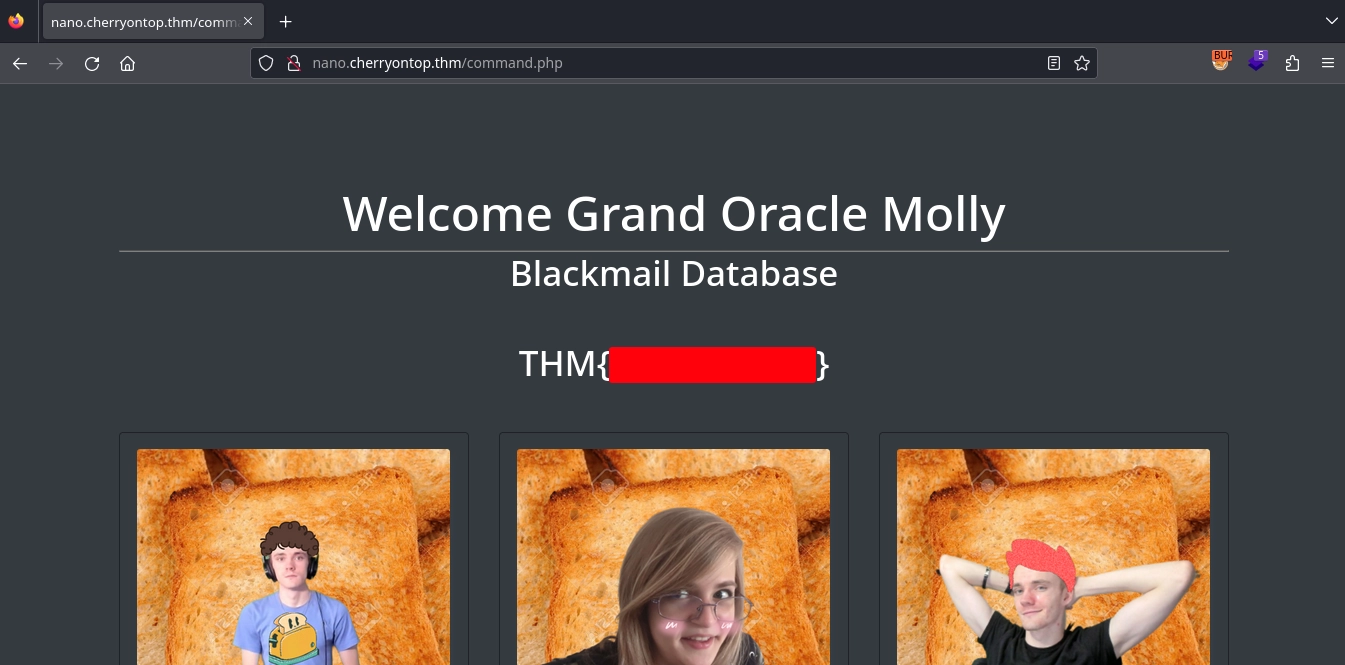 Using the discovered credentials to login, we get redirected to http://nano.cherryontop.thm/command.php, where we discover the flag for the Molly’s dashboard.