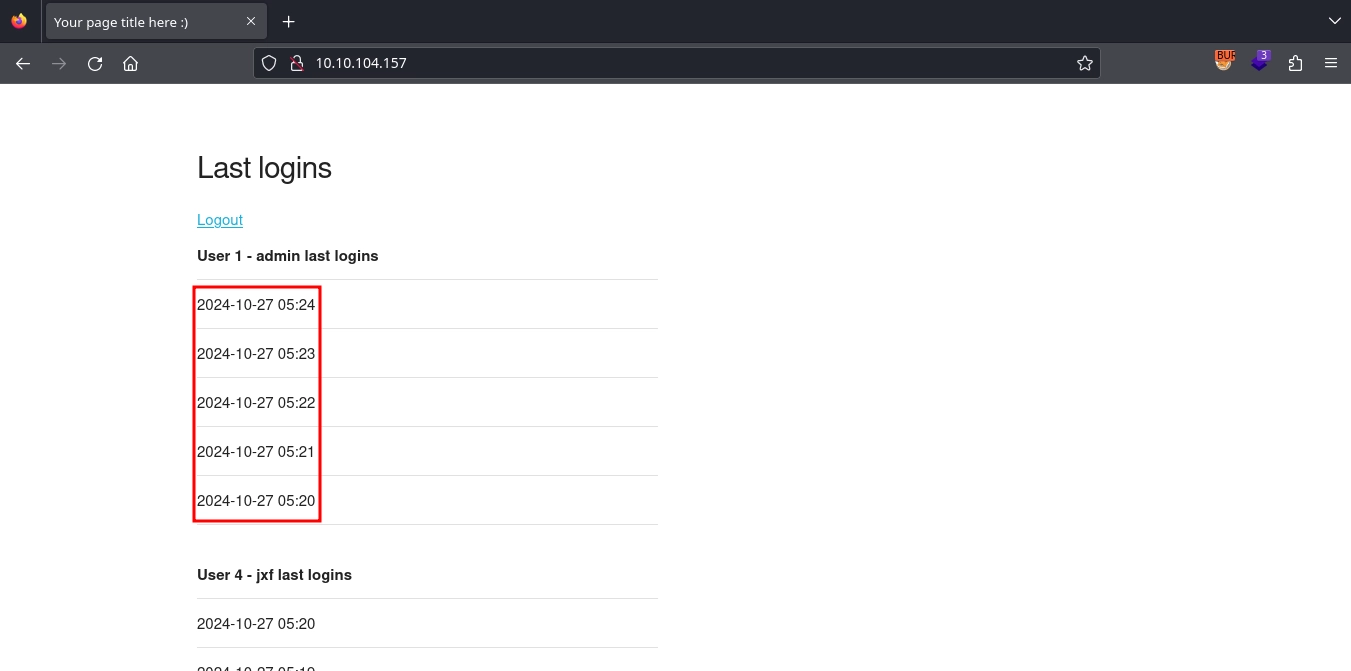 After logging in, we arrive at a page showing the last login times for users. Interestingly, the admin user logs into the application every minute.