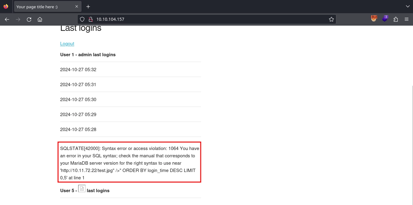 Since there were no issues during registration or login, and the " character in our payload only caused problems on the last logins page, this suggests a second-order SQL injection vulnerability. It seems the application incorrectly handles the username when fetching the last login records.