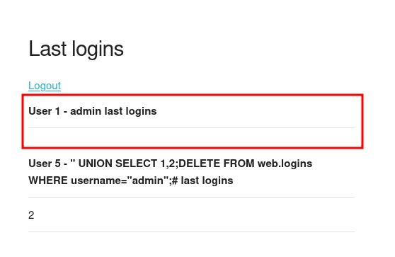 <thead><th>User 6 - " UNION SELECT 1;# last logins</th></thead><tbody>