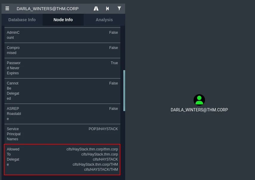 Checking the user DARLA_WINTERS on BloodHound, we see that the user is able to perform constrained delegation.