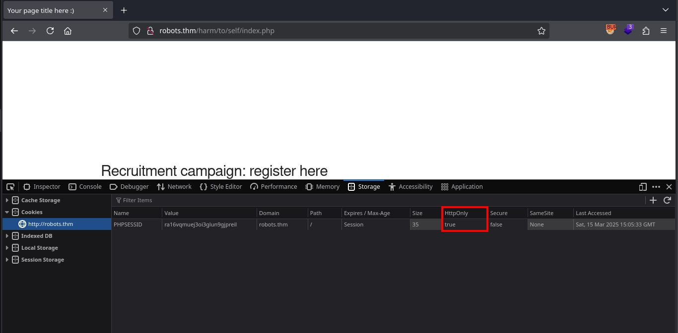 Checking the cookies for the server, we notice that the PHPSESSID cookie is HttpOnly, meaning we cannot directly steal cookies using document.cookie.