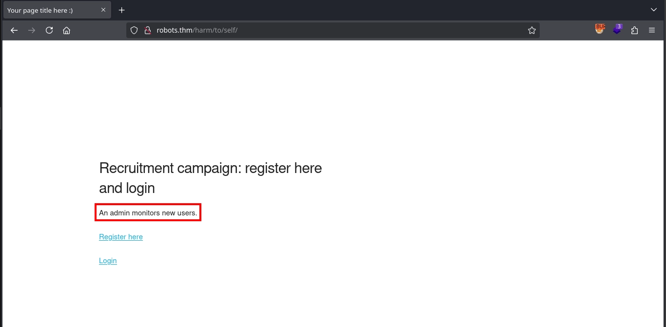 Now, visiting http://robots.thm/harm/to/self/, we find a page with links to register and login, along with an intriguing message: