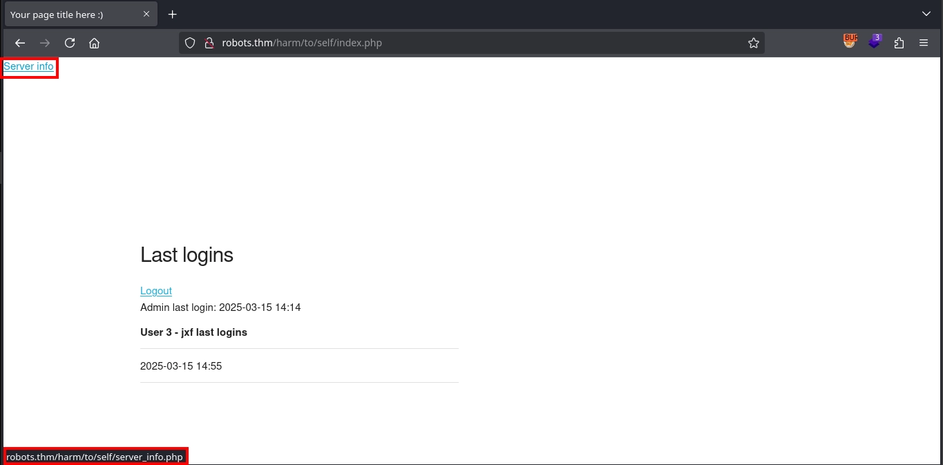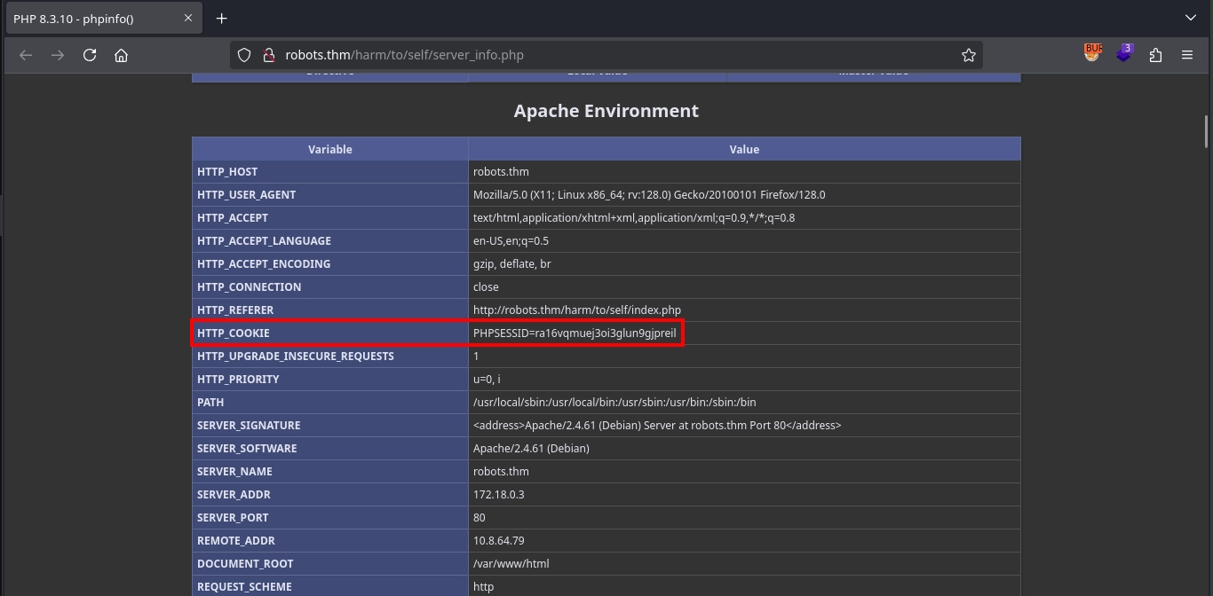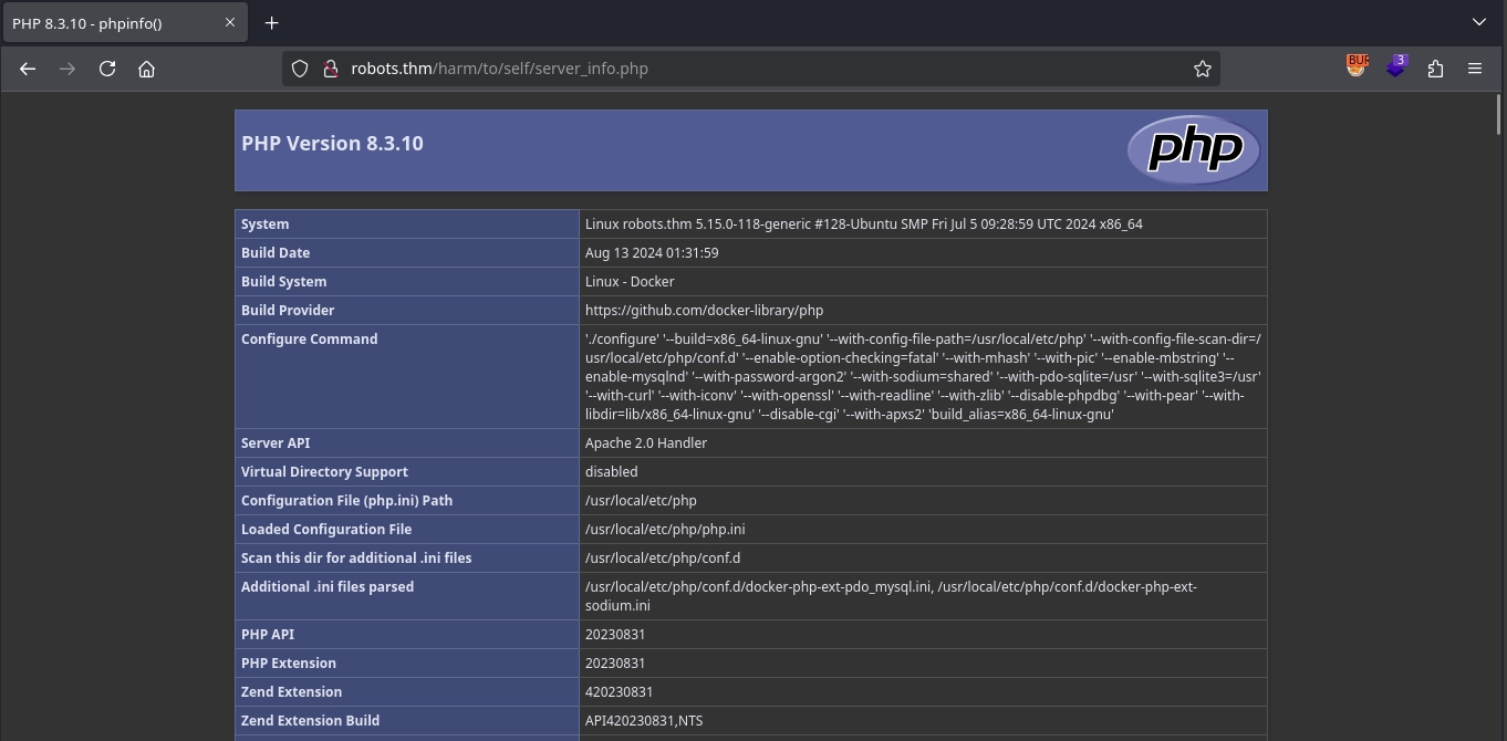 Visiting http://robots.thm/harm/to/self/server_info.php, we find that it simply prints phpinfo().