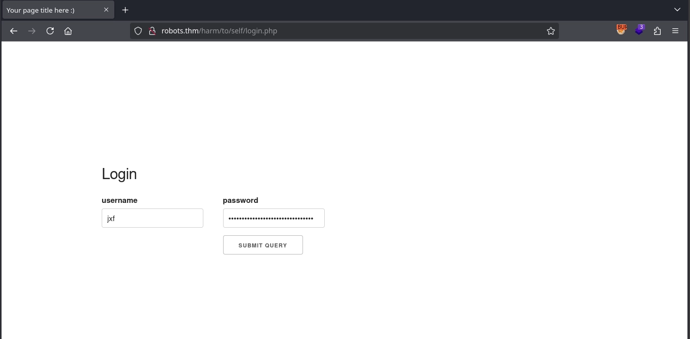 We navigate to the login page at http://robots.thm/harm/to/self/login.php and authenticate using: jxf:3f690378fd35dc4bbb4972af876f74e8
