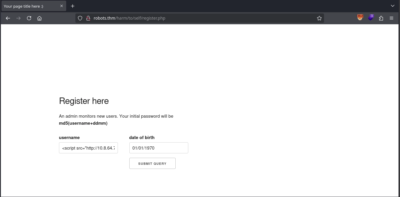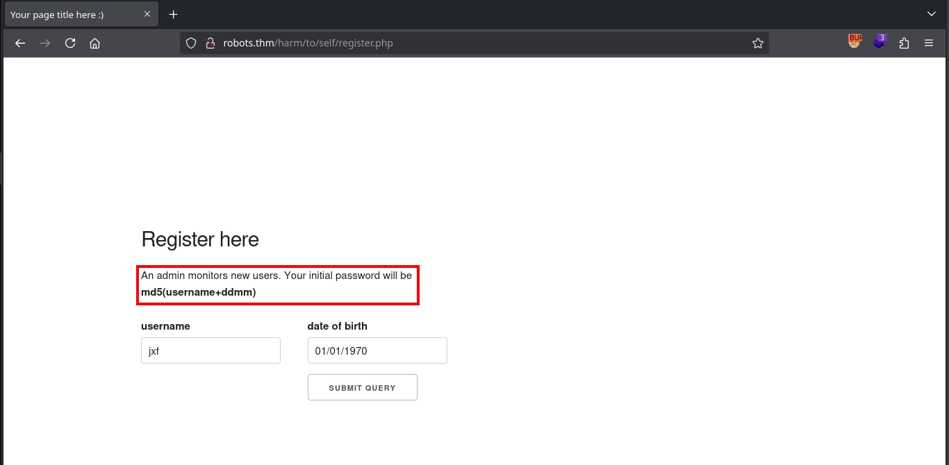 Checking the register page at http://robots.thm/harm/to/self/register.php, we see an additional message: