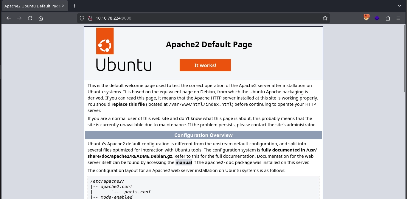 Visiting http://10.10.78.224:9000/, we are presented with the default Apache2 page.