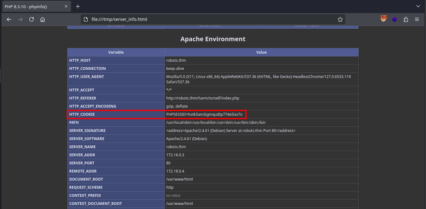 However, revisiting the /harm/to/self/server_info.php endpoint, we see that phpinfo() prints out the session details, including the PHPSESSID cookie.