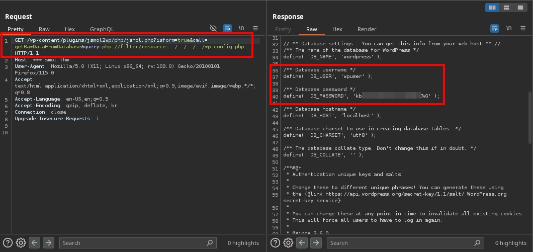 We confirm that the vulnerability exists, as the request returns the contents of the wp-config.php file and this file includes the database credentials: wpuser:kb[REDACTED]%G