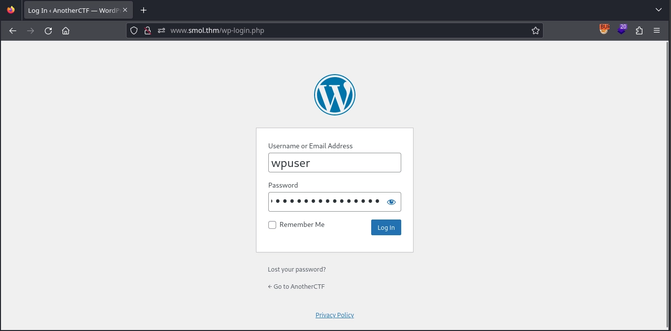 We can test these credentials for the WordPress login at http://www.smol.thm/wp-login.php.