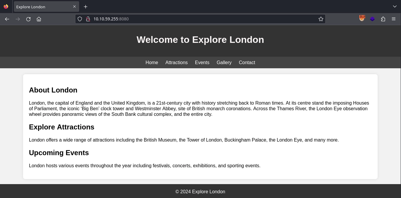 Visiting http://10.10.59.255:8080/, we see a page about London.