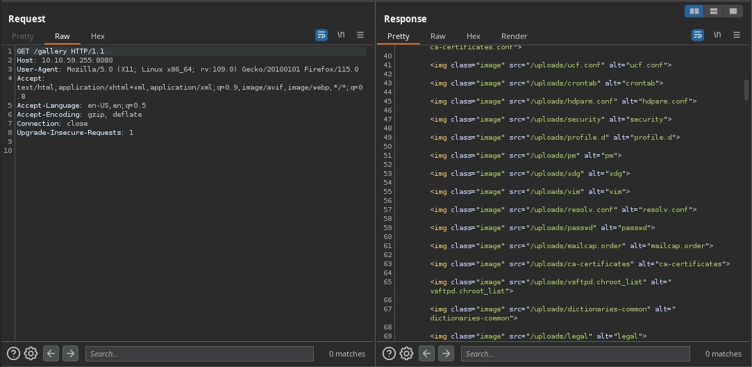 After this, if we make a request to the http://10.10.59.255:8080/gallery endpoint, we see it lists the contents of the /etc directory instead of /home/beth/uploads.
