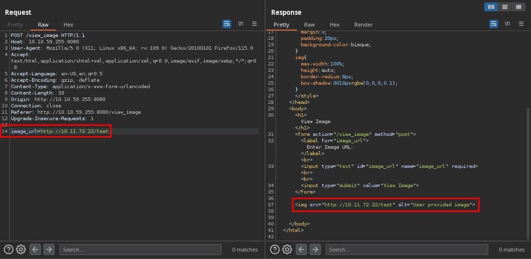 Testing the form with a URL for our server shows that it uses the image_url parameter to send our input. However, we don’t observe any requests being made to our server; it appears the application simply takes our input and displays it using the img tag.