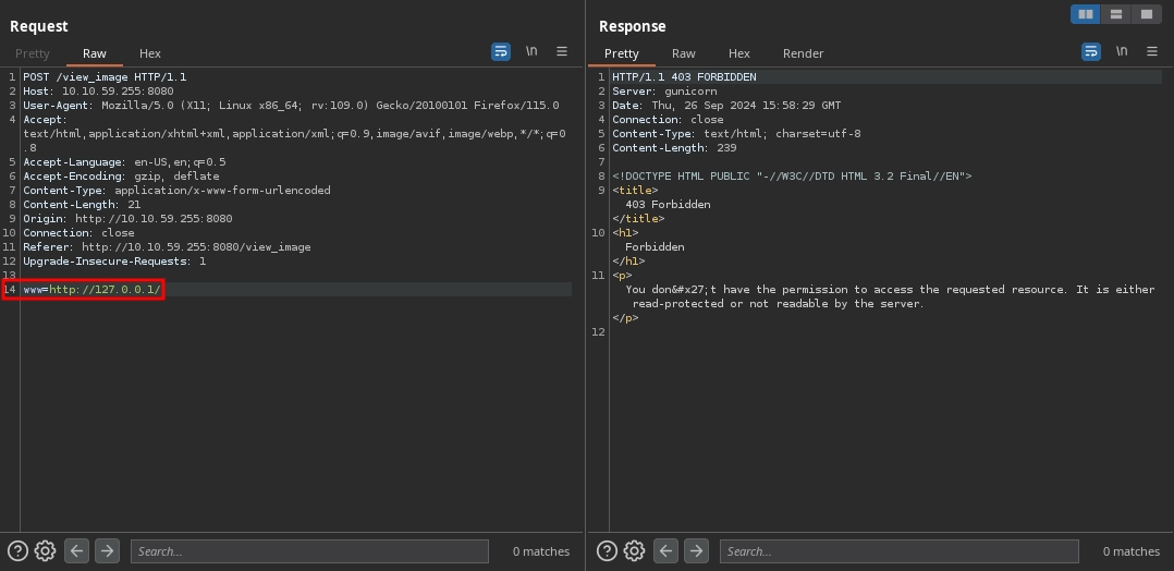 However, when attempting this, we see that using 127.0.0.1 or localhost in our URL results in a 403 FORBIDDEN response. This indicates that there is likely a filter in place.