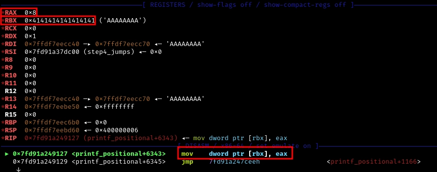 We can see that it crashes inside printf because it attempts to write the value 8 to the address 0x4141414141414141, which is not a valid memory address that the program can access.
