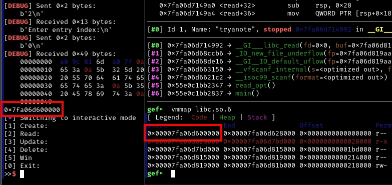 libcaddress, we simply overwrite theGOTentry forexitwith the address of the one gadget, which we calculate using the leakedlibcaddress.