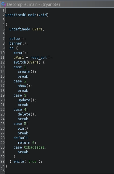Opening the binary in Ghidra and examining the main function, we can see that it is relatively straightforward.