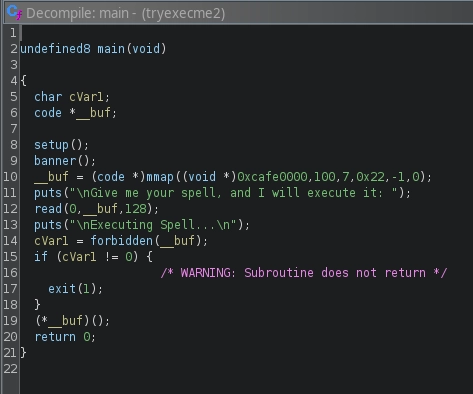 First, it prints a banner, then maps a readable, writable, and executable memory region to the __buf variable. It then prompts the user for input and reads 128 bytes into the __buf variable. After that, it passes the buffer containing our input to the forbidden function. If the return value from the function is non-zero, the program exits. If the return value is zero, it simply executes our input as code.