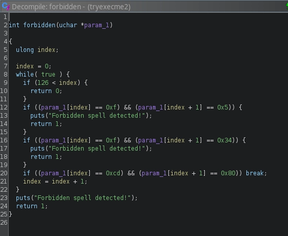 Checking the forbidden function, we can see that it is also quite simple. It iterates through all the bytes in our input and checks for the byte sequences \x0f\x05, \x0f\x34, and \xcd\x80, which correspond to the opcodes for syscall, sysenter, and int 0x80, respectively. These opcodes allow us to perform system calls. If any of them are found in the input, the function returns 1; otherwise, it returns 0.