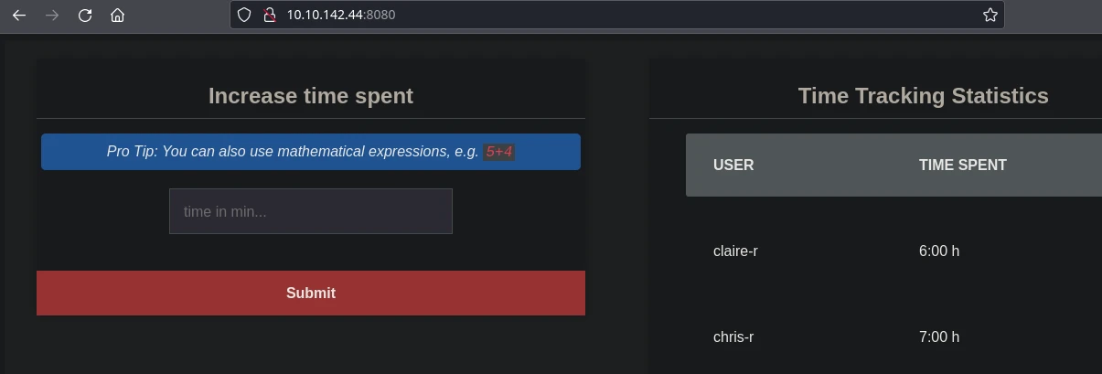 We get an input form that makes a POST request to /time and a table listing time spent by users.