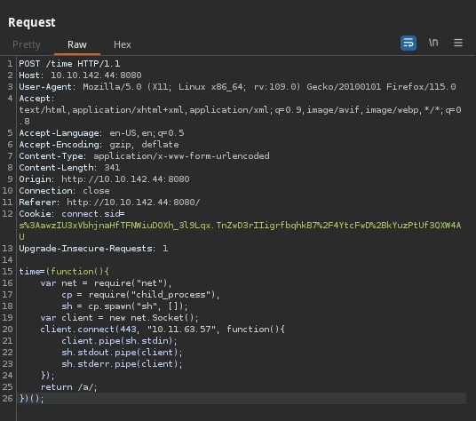 Since we already know our input will be passed to the eval function using a node.js reverse shell payload as input.