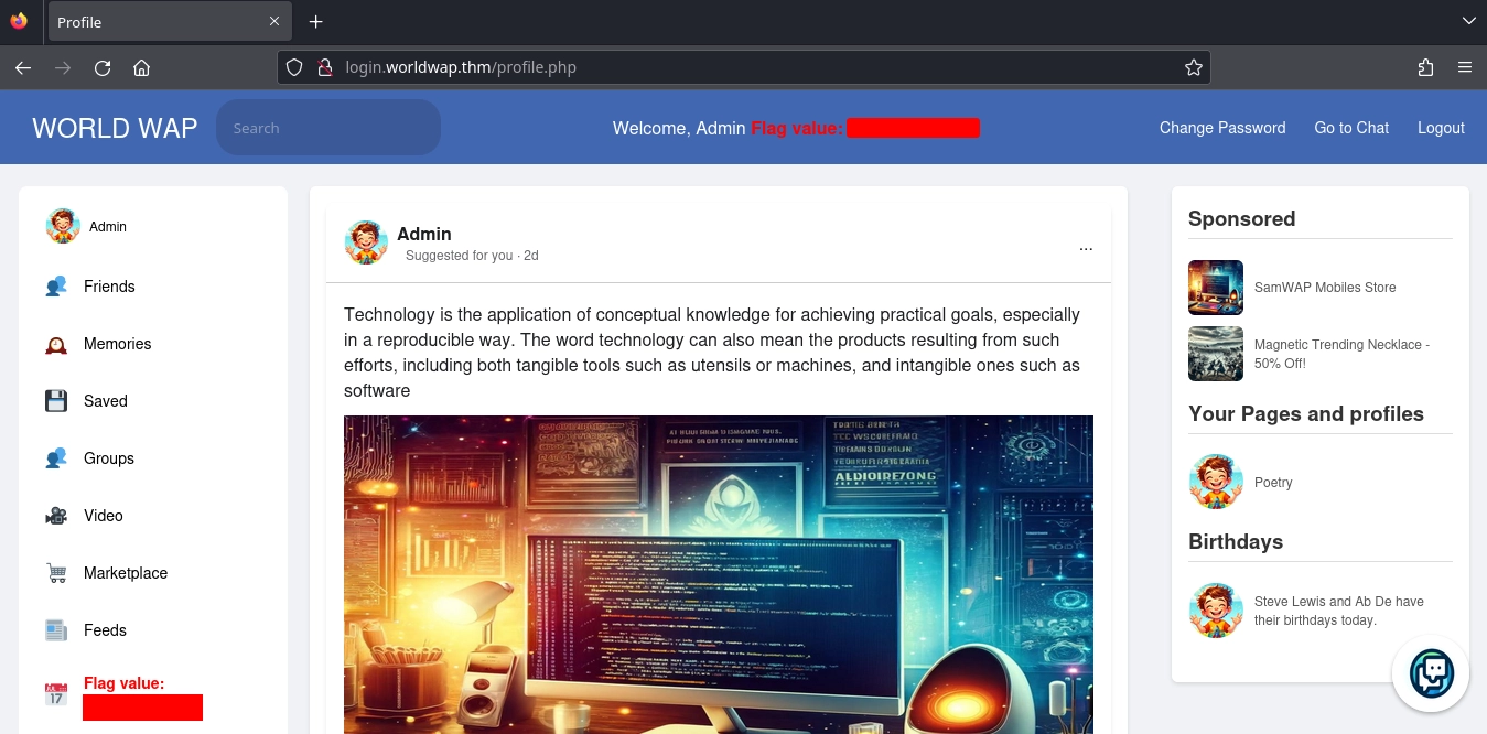 After logging in, we get redirected to http://login.worldwap.thm/profile.php, where we get the admin flag.