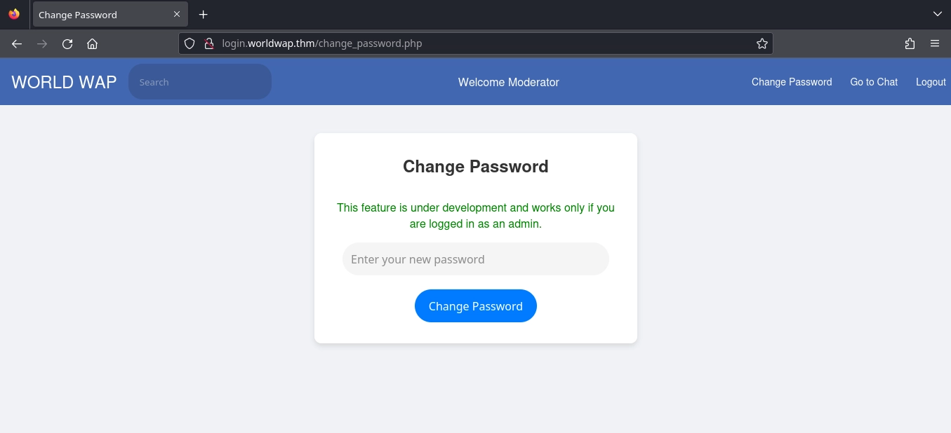 At http://login.worldwap.thm/change_password.php, admin users are able to change passwords.