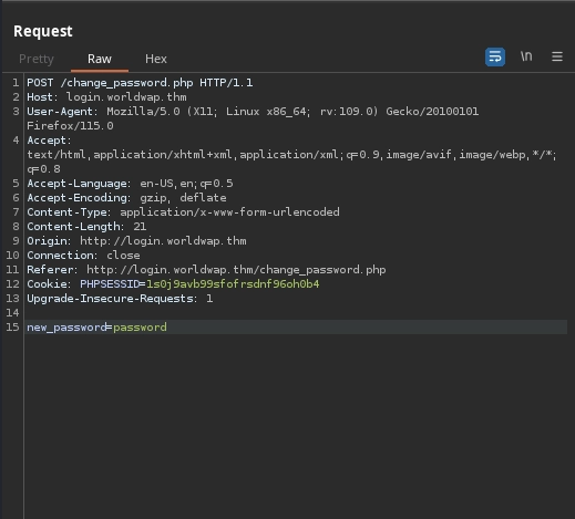 The request made for password change is a POST request to http://login.worldwap.thm/change_password.php endpoint with application/x-www-form-urlencoded content type and only requires the new password.
