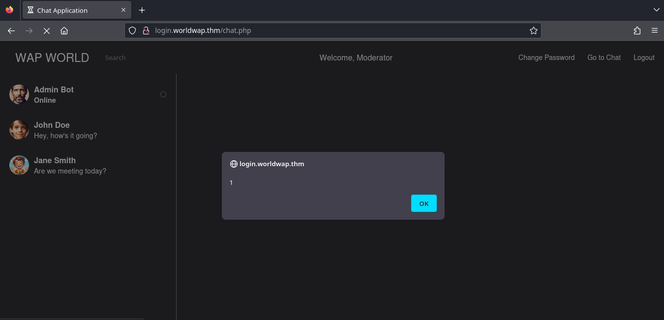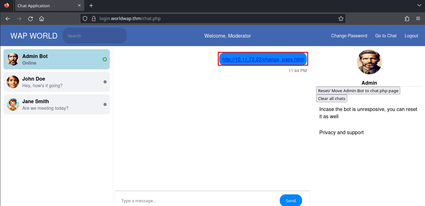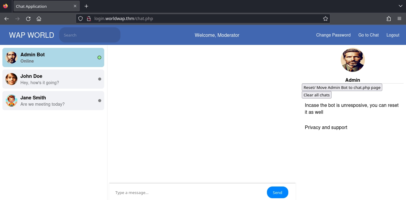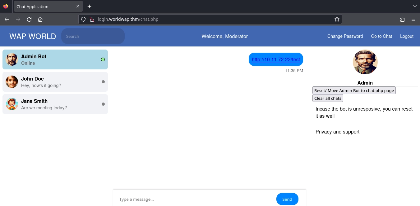 At http://login.worldwap.thm/chat.php, we are able to send messages to the admin user.