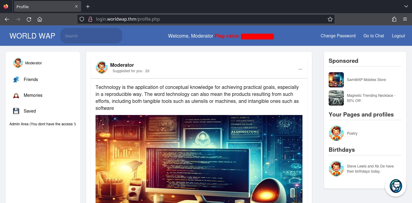 Remembering the cookie is also set for any subdomain, we visit http://login.worldwap.thm/login.php and get redirected to http://login.worldwap.thm/profile.php, where we get the moderator flag.