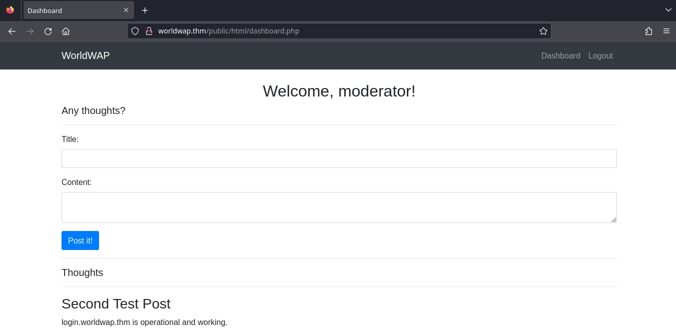 After changing our cookie to the moderator’s cookie and visiting http://worldwap.thm/public/html/ we get redirected to http://worldwap.thm/public/html/dashboard.php.