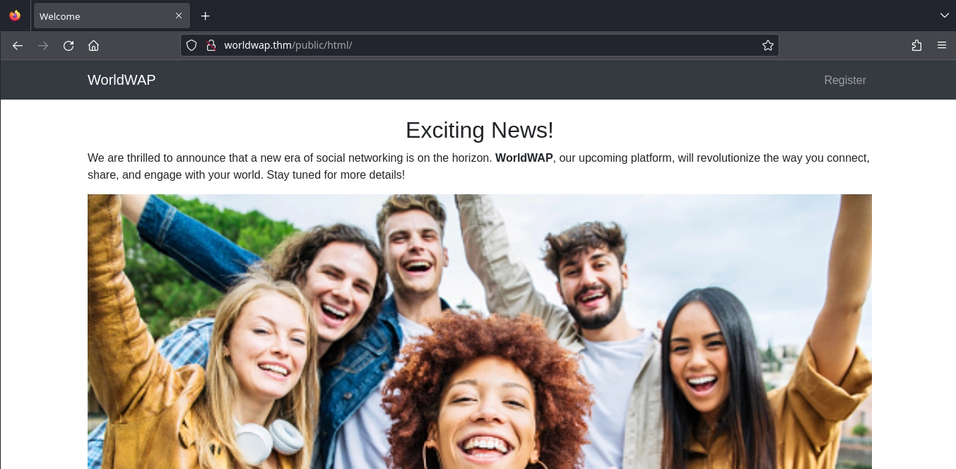 Visiting http://worldwap.thm/, we get redirected to http://worldwap.thm/public/html/.