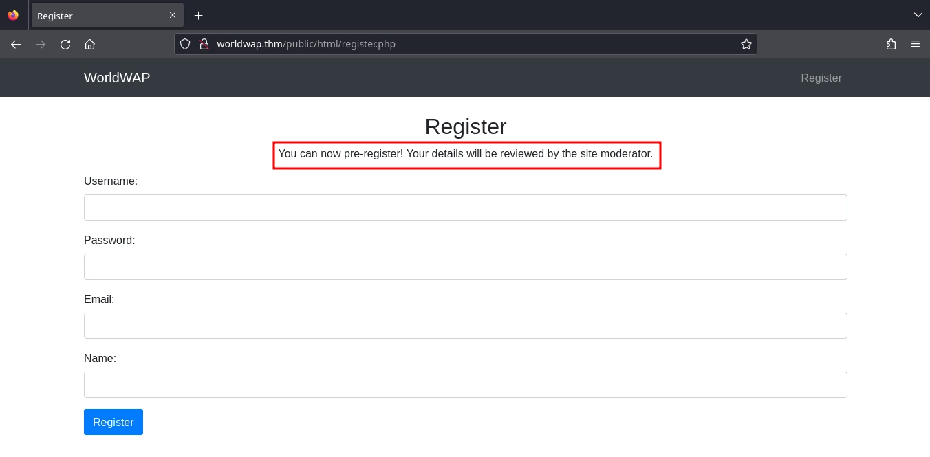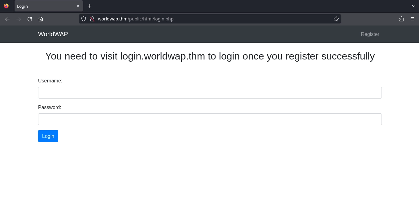 After registering an account, we get redirected to http://worldwap.thm/public/html/login.php, where we can login.