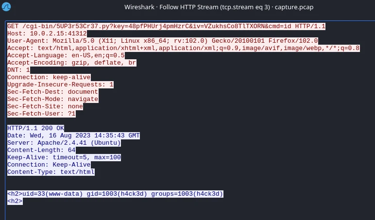After the decryption, traffic shows attackers were able to run commands by making a request to /cgi-bin/5UP3r53Cr37.py.